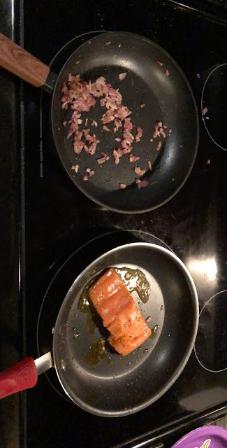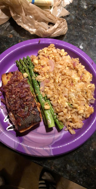 This week I got some salmon, asparagus and onions from my mom. First I diced the onions, threw olive oil on a heating pan and caramelized them. I let the onions sit there and do its thing, until midway I seasoned it with salt to taste. Midway through the onions, I got another pan and started on the salmon. I seasoned the salmon and threw on heated pan skin down first. Cooked for around 4-5 minutes then flipped and cooked until firm and browned. Onions and fish was done, so I pan roasted some asparagus real quick. I then grabbed leftover rice, eggs, soy sauce and diced onions and made fried rice.