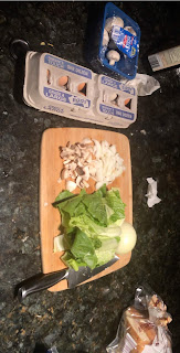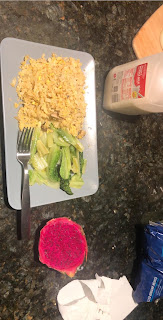 This week's challenge asked for a "go-to meal" that fit the USDA plate recommendations so I thought, what is more go-to than fried rice? I started with romaine lettuce that I chopped and threw in a pan, fried on high with oil, water and garlic powder (I ran out of garlic). Then I chopped onions and mushrooms, beat two eggs (seasoned) and cooked rice which I then chilled in freezer for 20 minutes. After the lettuce was done frying, I cooked the mushrooms and onions first with avocado oil then added rice and eggs. Add soy sauce to taste then seasoned with black pepper. This simple meal fulfills all recommendations from a USDA plate, with the egg serving as protein and dairy, white rice as whole grains (I didn't have actual whole grains), onions, mushrooms and lettuce as vegetables, and avocado oil as healthy fats. Only fruit I had was a dragonfruit my mom left when she visited so I ate that and in case eggs wasn't dairy enough I drink milk.