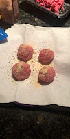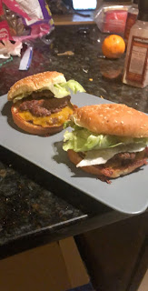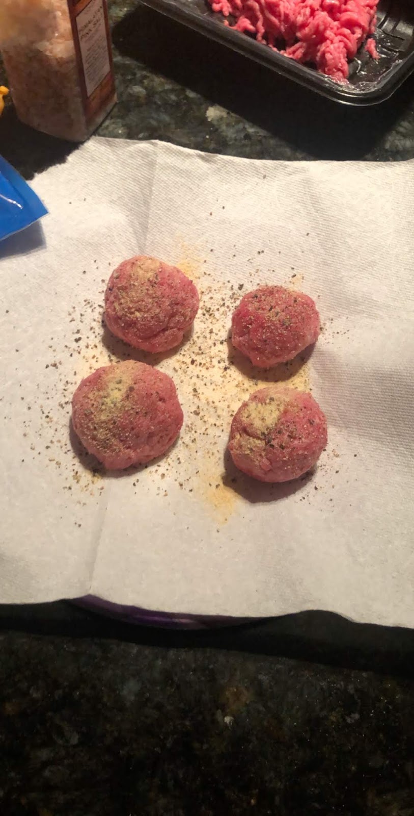 Back home, I started making the burgers. I used buns and cheese from my roommate, and I had some lettuce laying around. I rolled out four balls of ground beef and seasoned it with pink salt, ground pepper, and garlic powder. After that you smash the balls flat on a medium high heat pan with a light coating of oil, flip when cooked then put a slice of cheese on two patties.